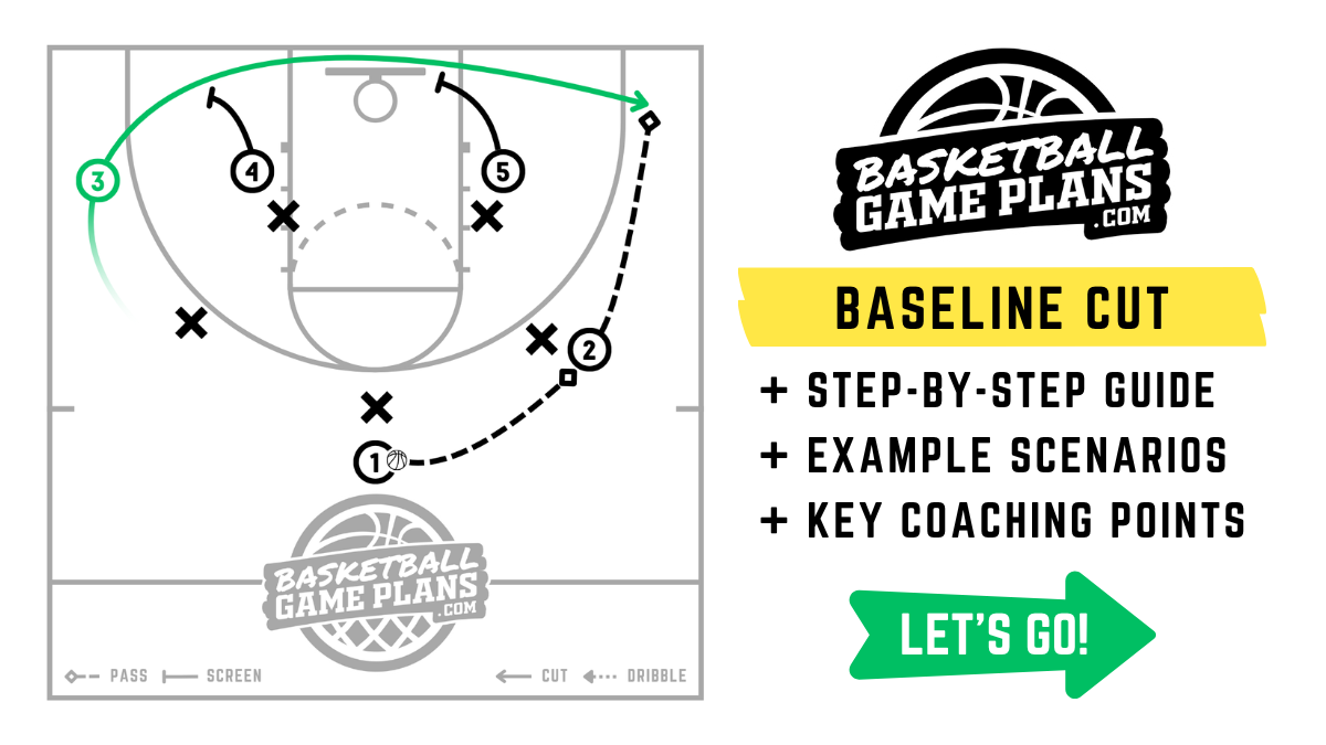 A baseline cut is an off-ball movement where an offensive player cuts along the baseline (the boundary line at the end of the court) to create separation from their defender and get into a better position for a pass or scoring opportunity.