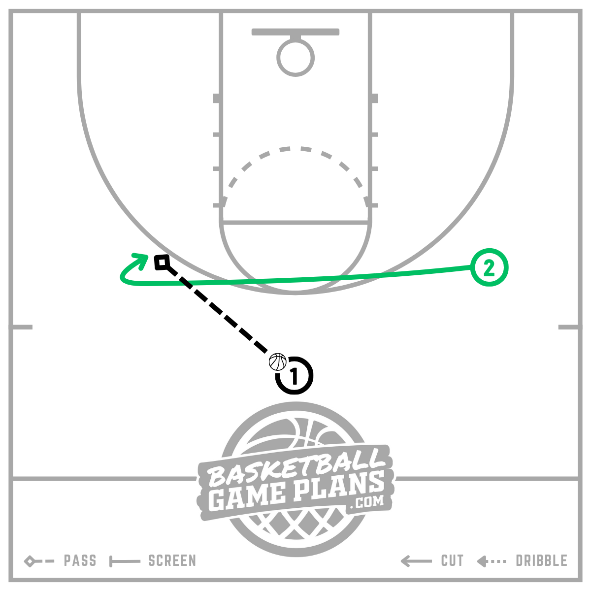 (1) passes the ball to (2) in the wing when they are turned towards the basket, showing a target hand, and ready to receive the pass. This sets up multiple potential offensive opportunities, including: