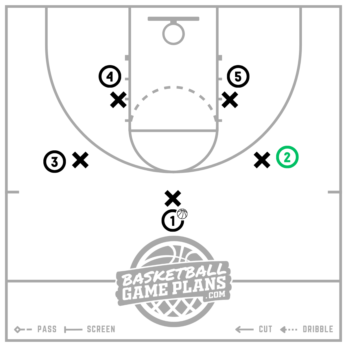 Note: In our example, the (5) pops out to the right wing to be a secondary option for the (1) if the (2) fails to get open after executing the Iverson cut.