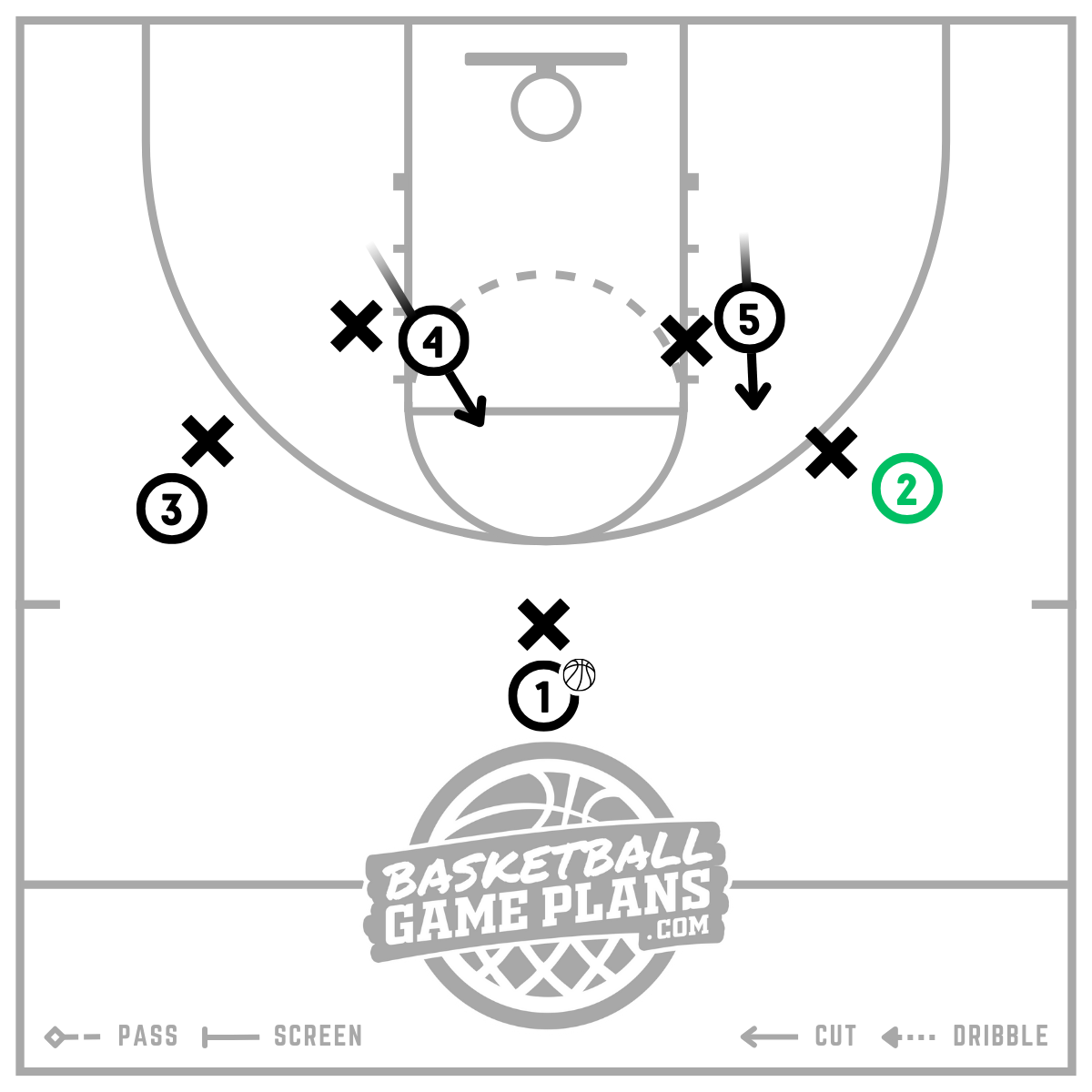 The post players (4) and (5) burst into positions above the free throw line to set a stagger screen across the top of the key. In our example, the power forward (4) breaks to the nail while the center (5) breaks up to just outside the right elbow and plant their feet to screen for (2) who is about to make the Iverson Cut.