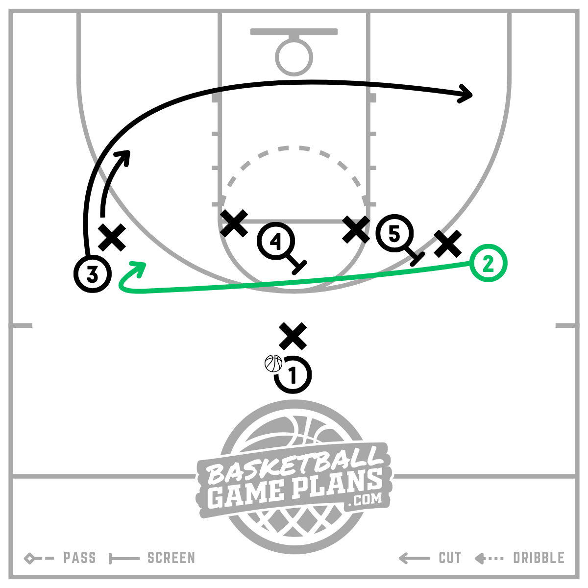 In our example, the small forward (3) simultaneously makes a deep or baseline cut to the opposite corner. The primary goal of this secondary cut by the (3) is to get the left wing defender to follow, clearing space for the (2).