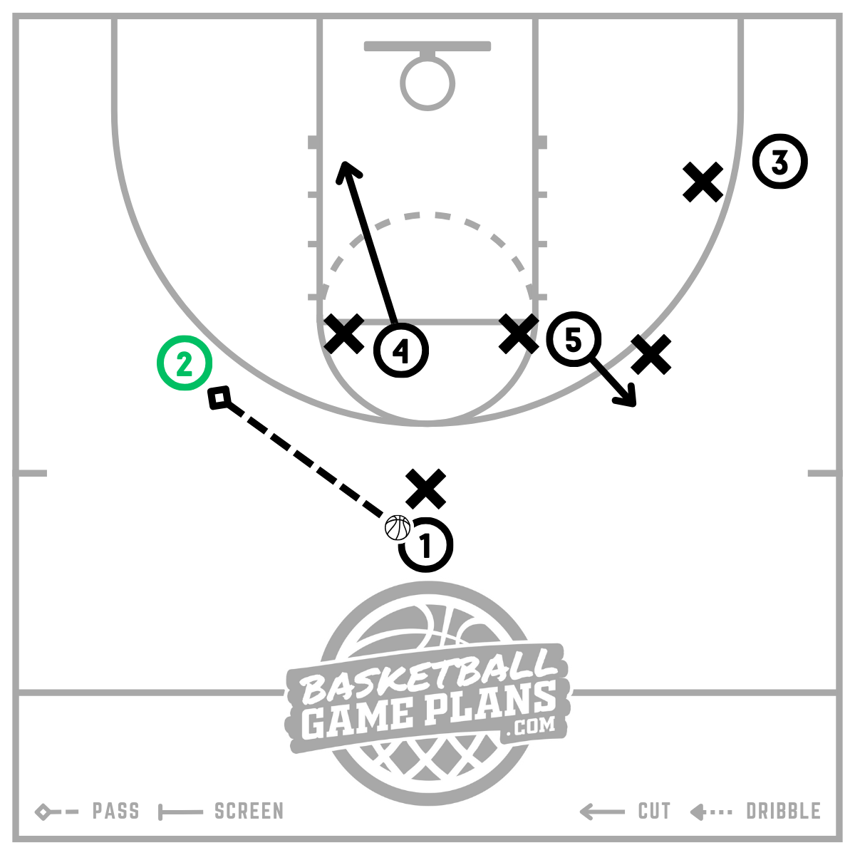 - Pick-and-Roll: As seen in diagram [4] of our example scenario, the (4) can roll down to the block or basket after setting the screen for the (2) for a quick pass and scoring opportunity.