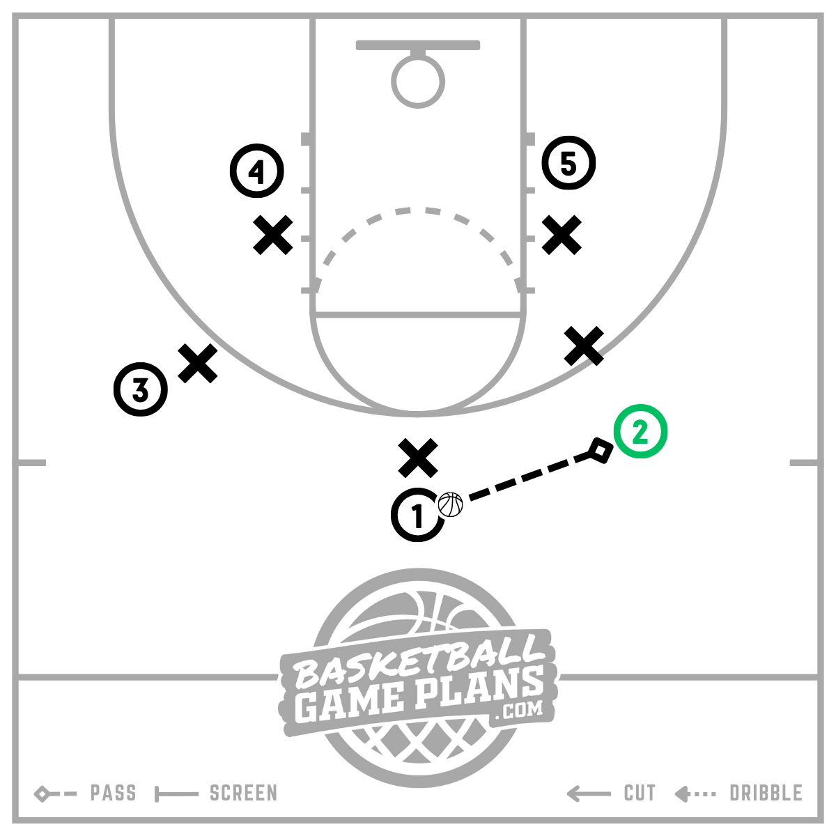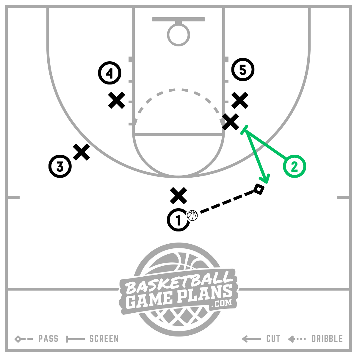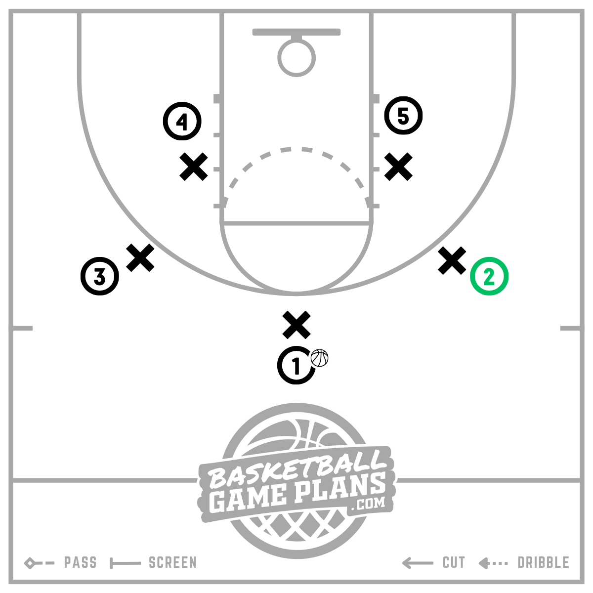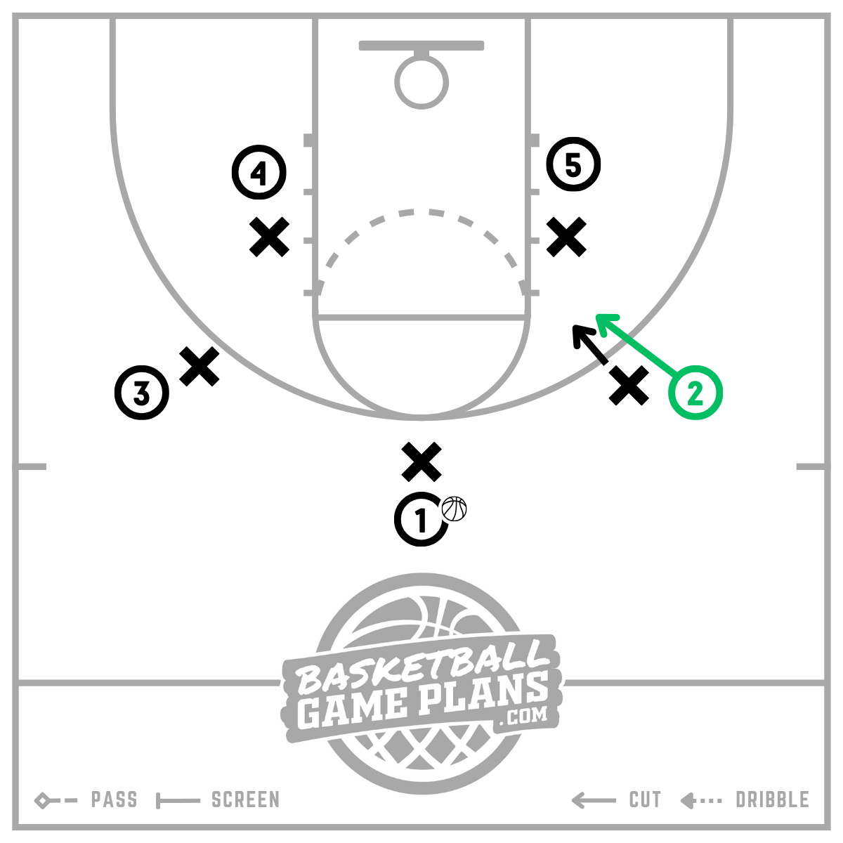 The shooting guard (2) is set up on the wing and ready to perform a V-cut in our example diagram [1].